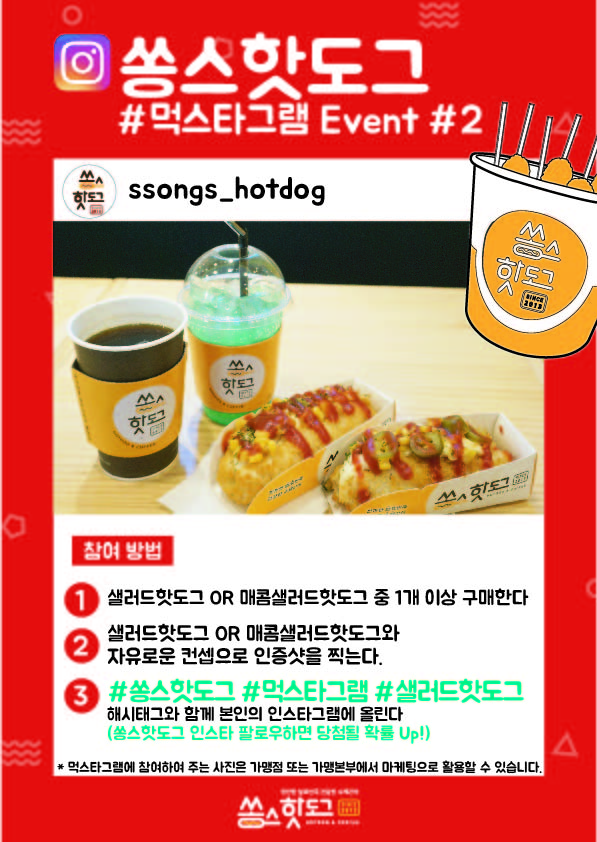 샐러드핫도그 or 매콤샐러드핫도그 중 한 개 이상 구입하시고 인스타그램에 샐러드핫도그 or 매콤샐러드핫도그 사진과 함께 #쏭스핫도그 #먹스타그램 #샐러드핫도그 해시태그와 함께 본인의 인스타그램에 올려주세요~