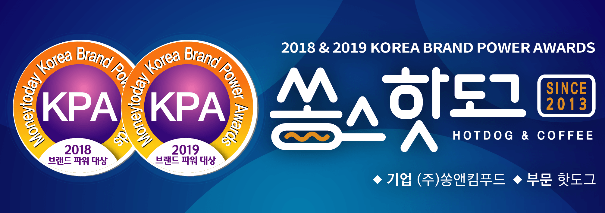 쏭스핫도그가 고객 여러분의 사랑과 관심으로 대한민국 브랜드 파워 대상에 2년 연속 수상하게 되었습니다.